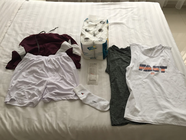 반바지 두 벌, 나시티 두 벌, 12롤 짜리 두루마리 휴지, 양말 한 켤레, 사진엔 없지만 클렌징폼까지. 모두 얼마일까?